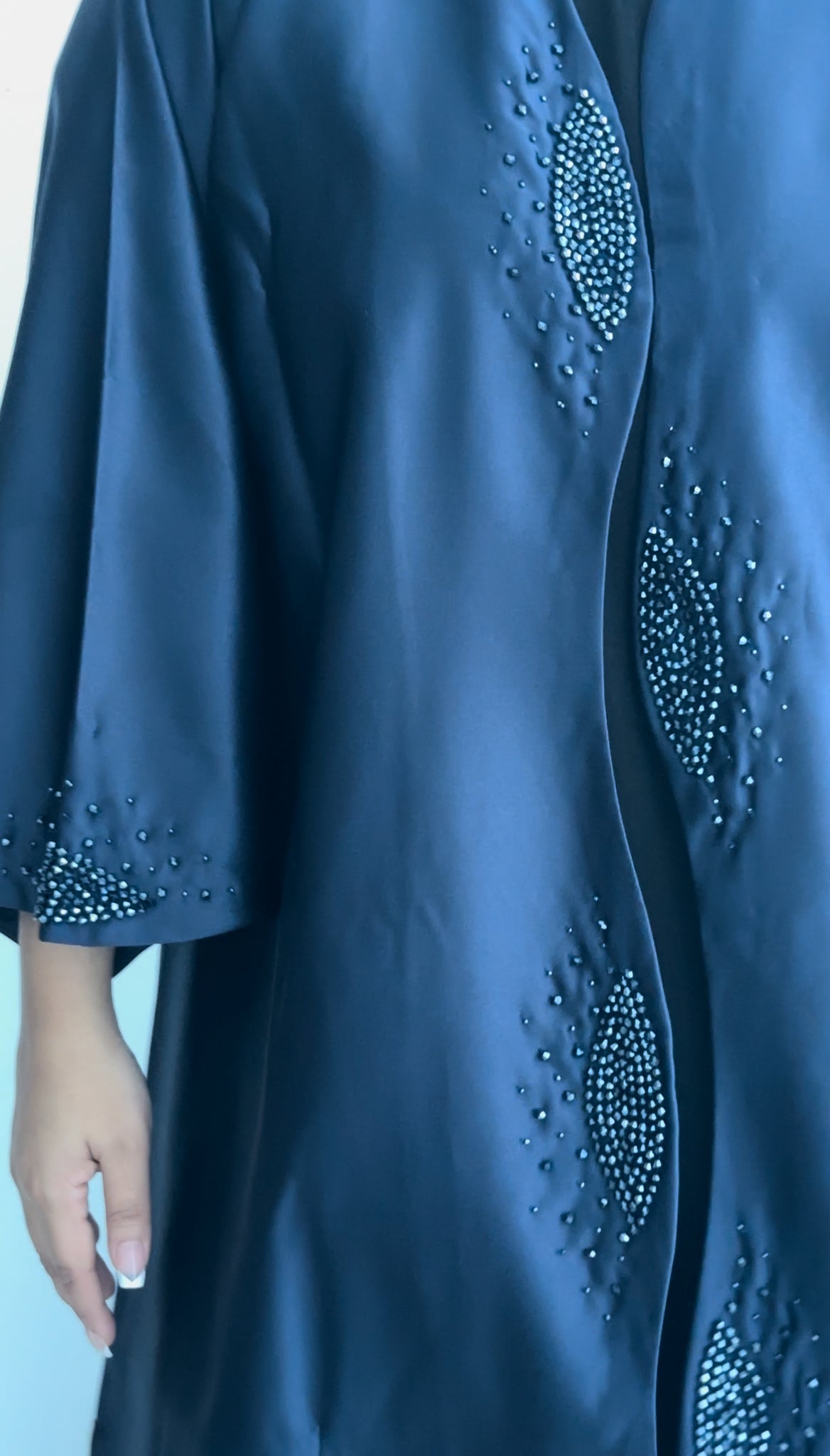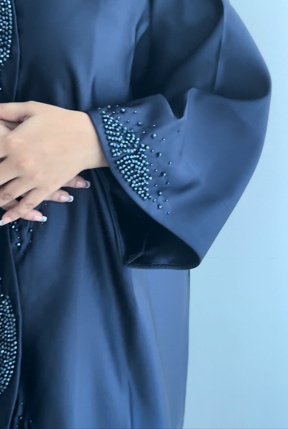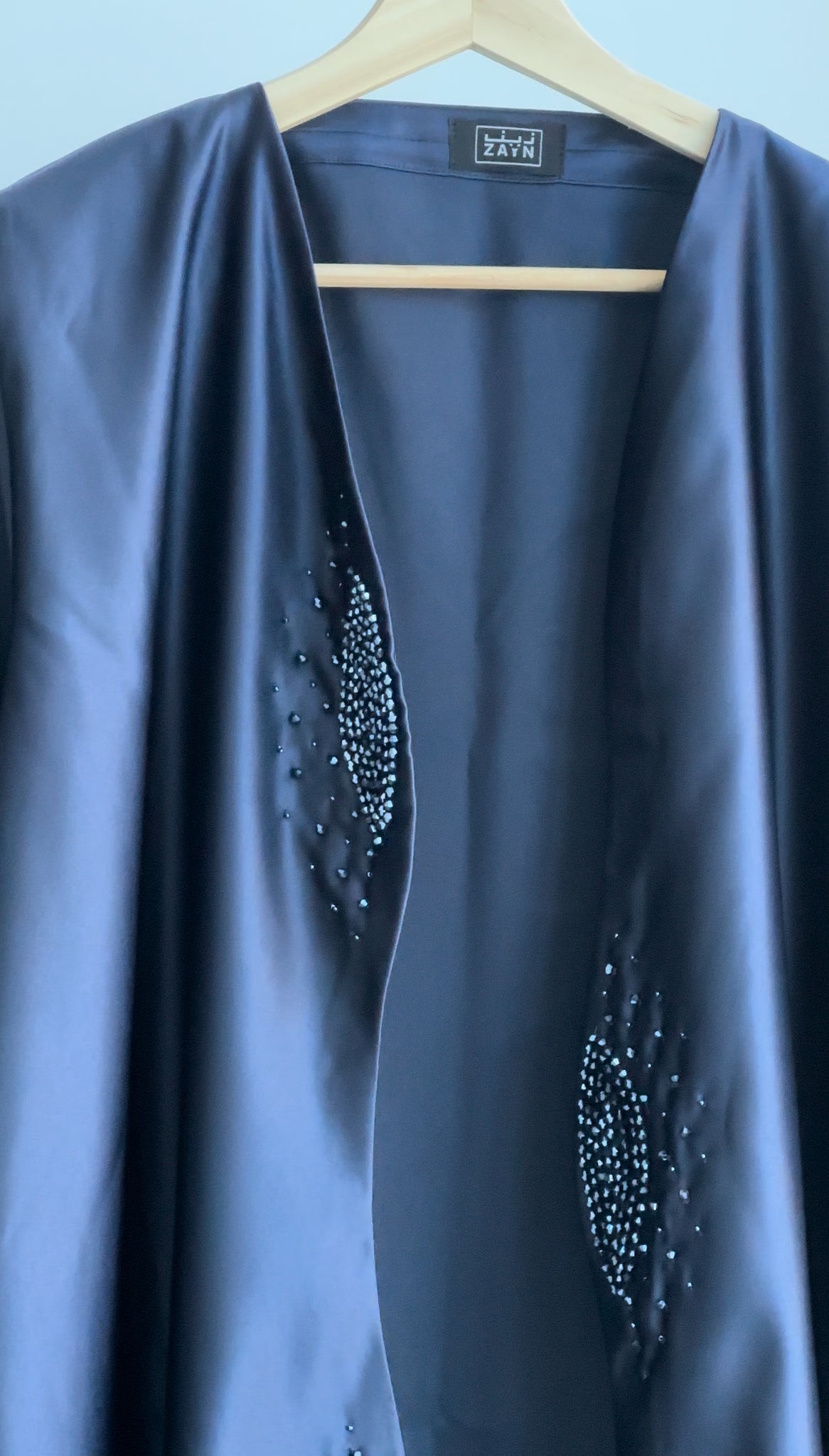 shop our favorite Classy Satin Abaya in Royal Blue with beautiful elegant stone work.
